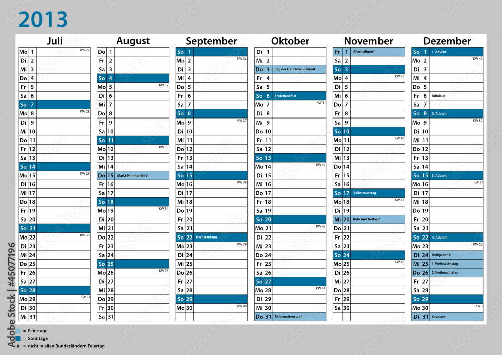 Kalender Deutschland 2013 Juli Dezember Stock Vector | Adobe Stock